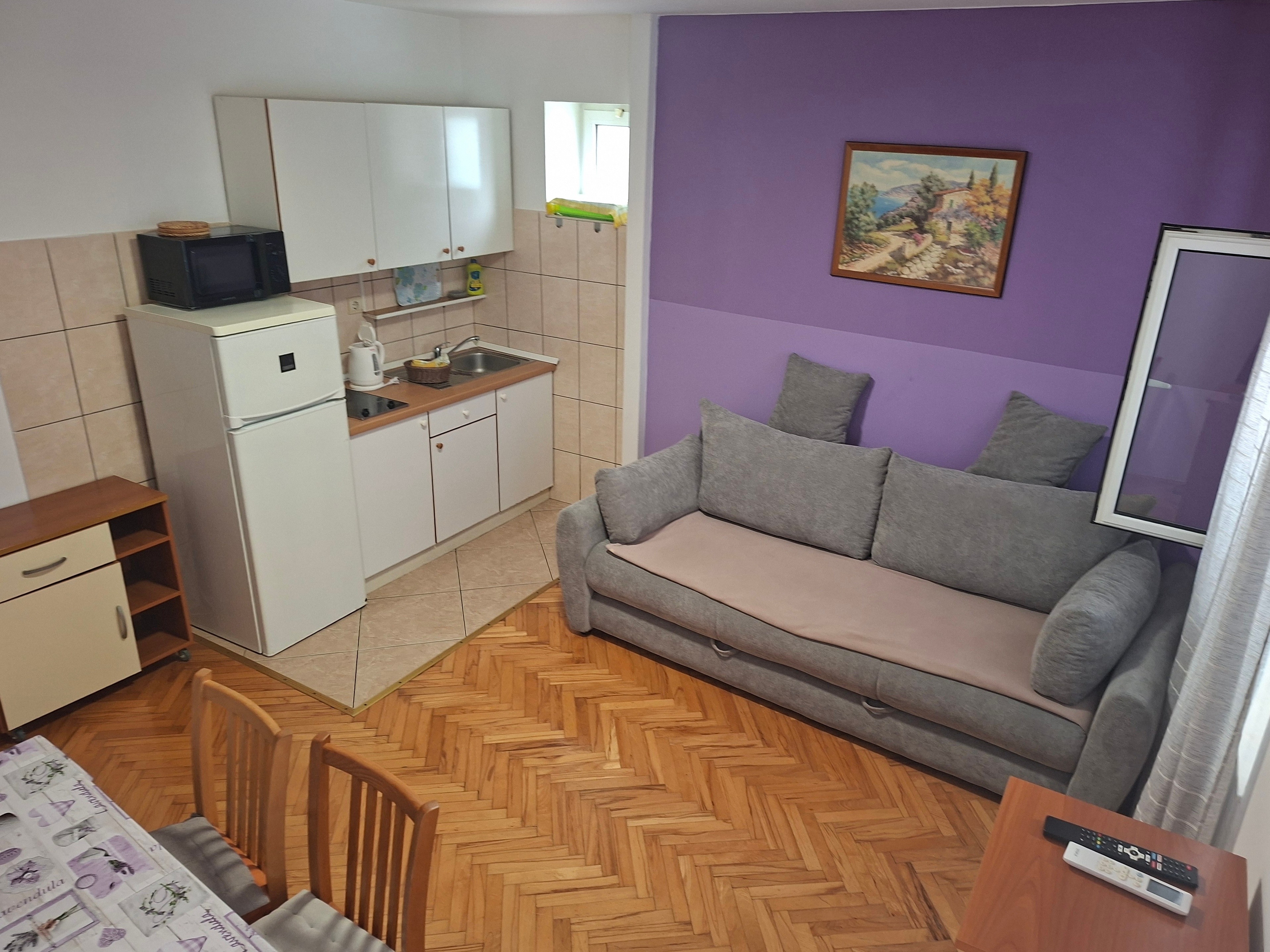 Apartment can accommodate 4 guests. Beds are situated in 1 sleeping rooms, but also in the living room, within 32m2. Guests can use a private balcony to enjoy the warm summer evenings. The apartment offers the sea view. For full enjoyment and relaxation there is a private barbecue for this accommodation guests only. This accommodation unit welcomes pets at an additional charge. INCLUDED IN THE PRICE: tourist tax, final cleaning, air-conditioning, parking, internet, baby cot, iron, ironing board, hairdryer, portable barbecue. OPTIONAL ADDITIONAL COSTS: pets (€5.00 per night). The availability of additional services for your chosen dates of stay, as well as their prices (if none are listed) must be checked ahead of time. Any additional services not shown in the price calculation are payable directly to the property owner and only if used by the visitor. Discounts to the base price: free day 14=13 (for reservations of 14 or more days you get one free day for the stay until 31122026).