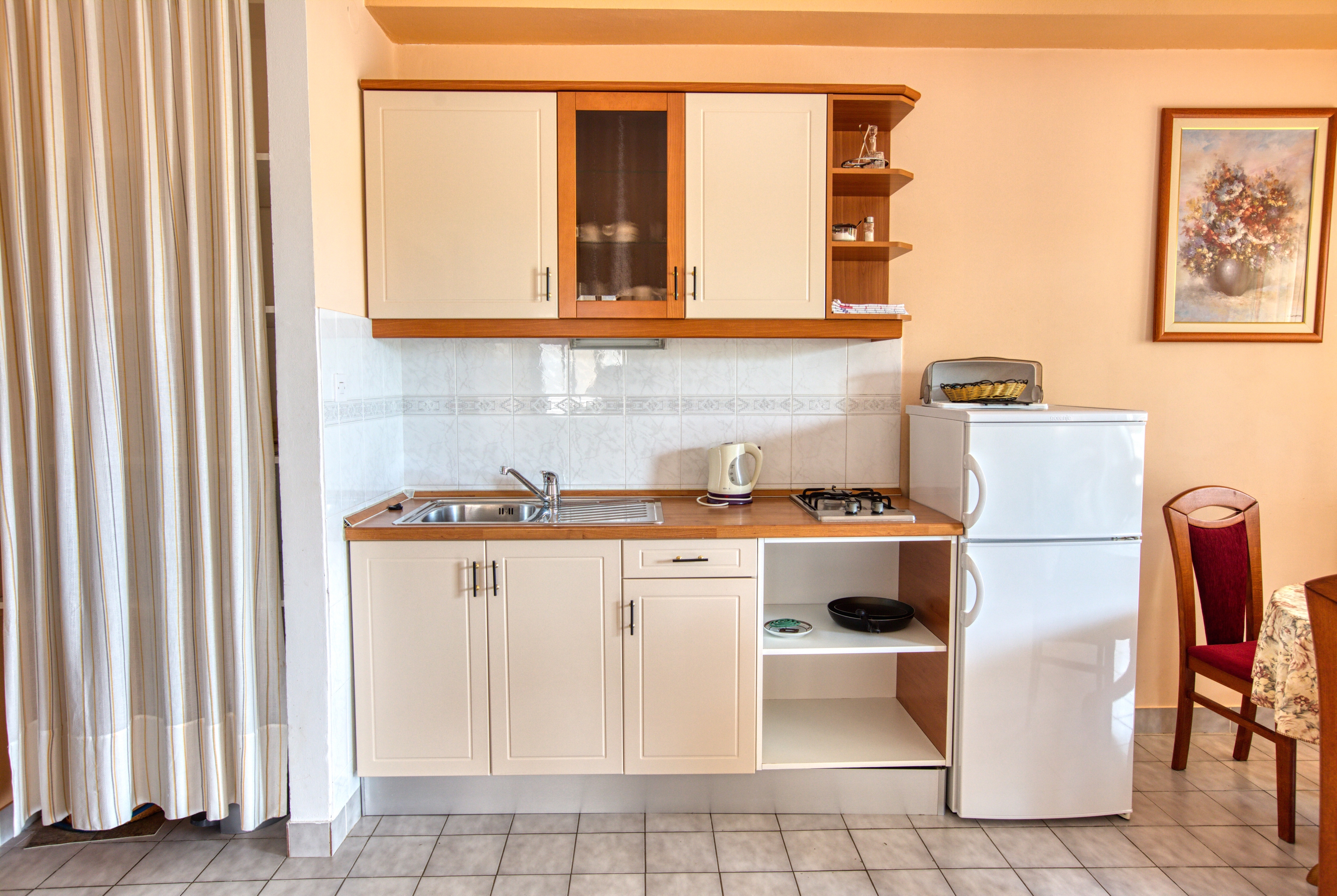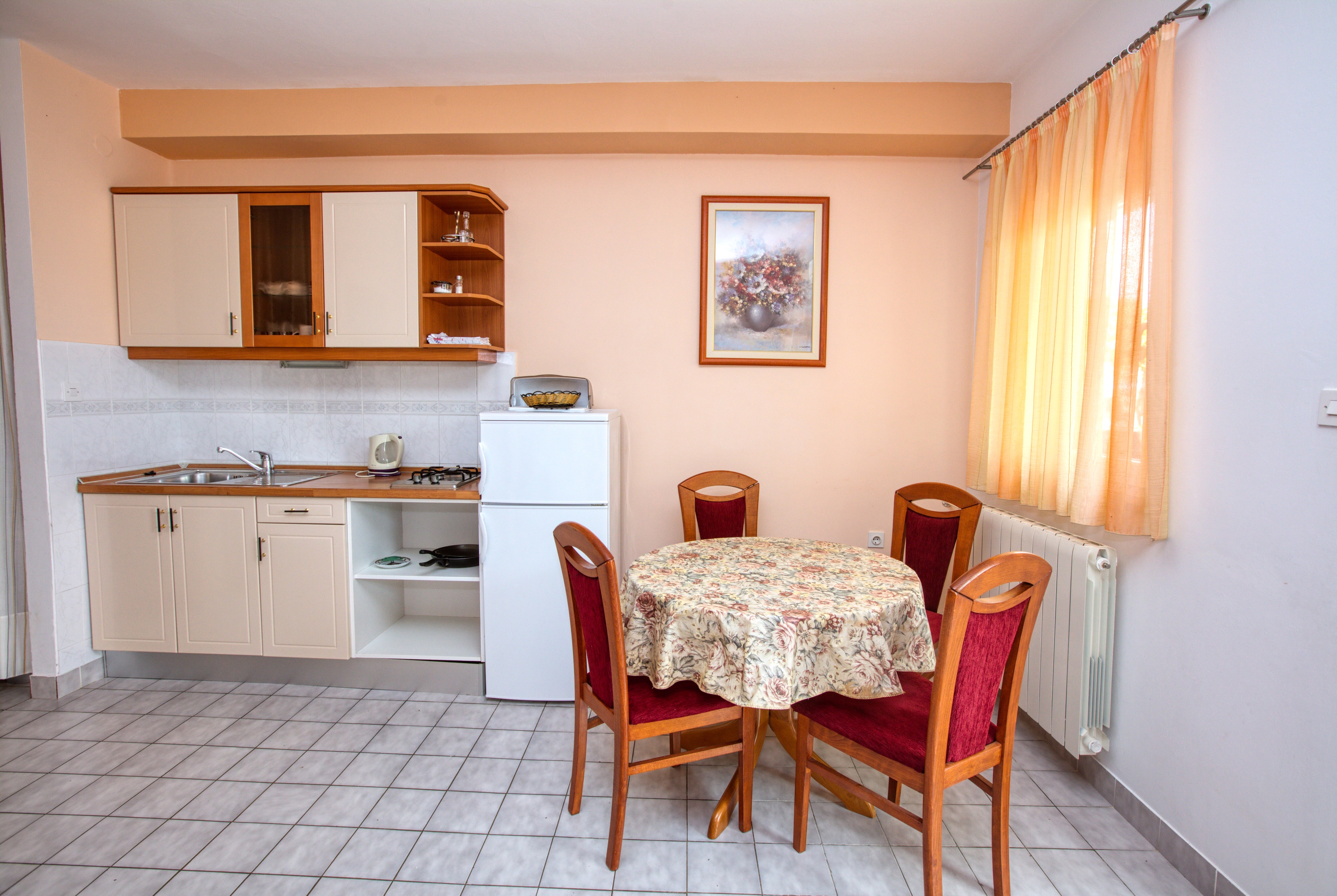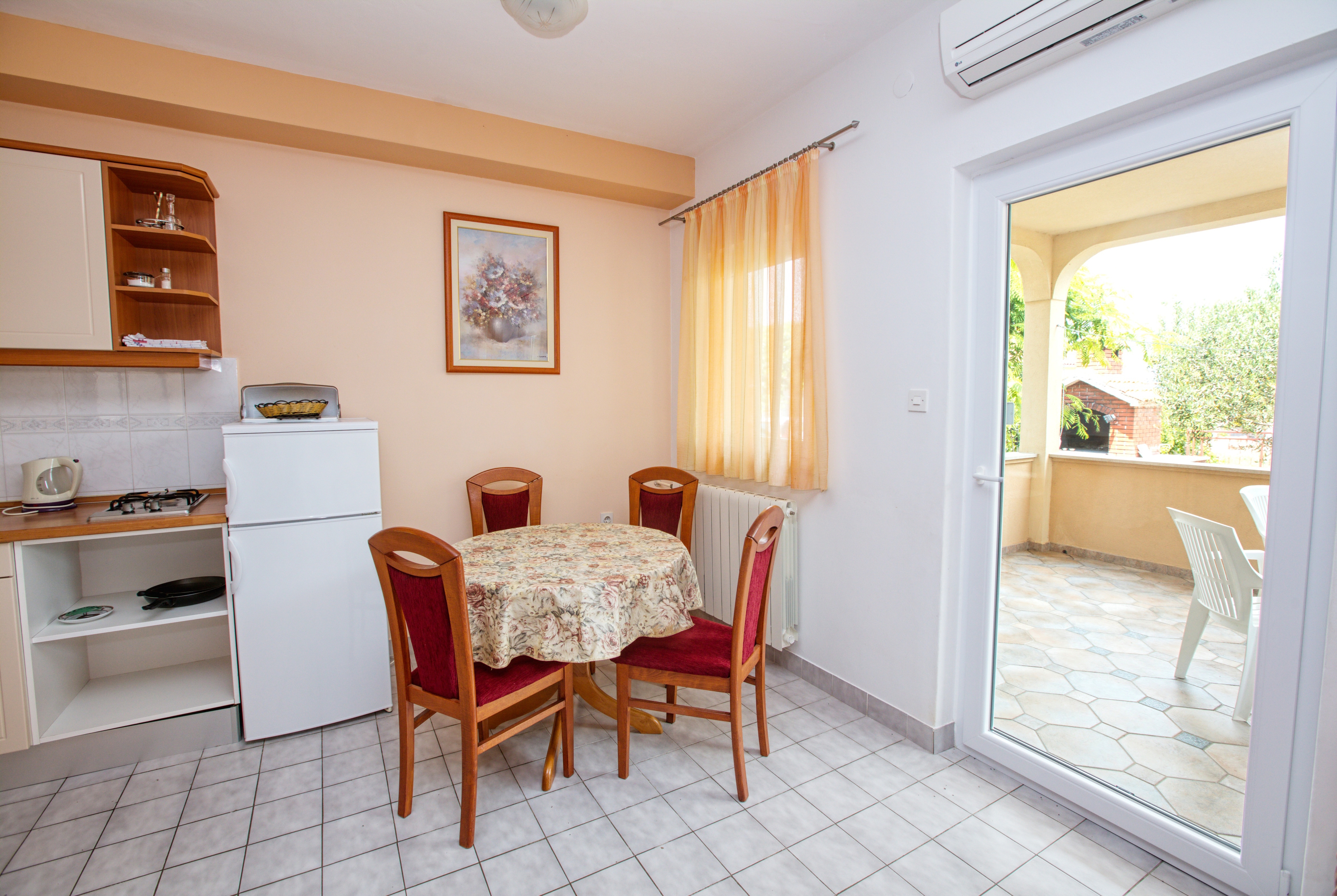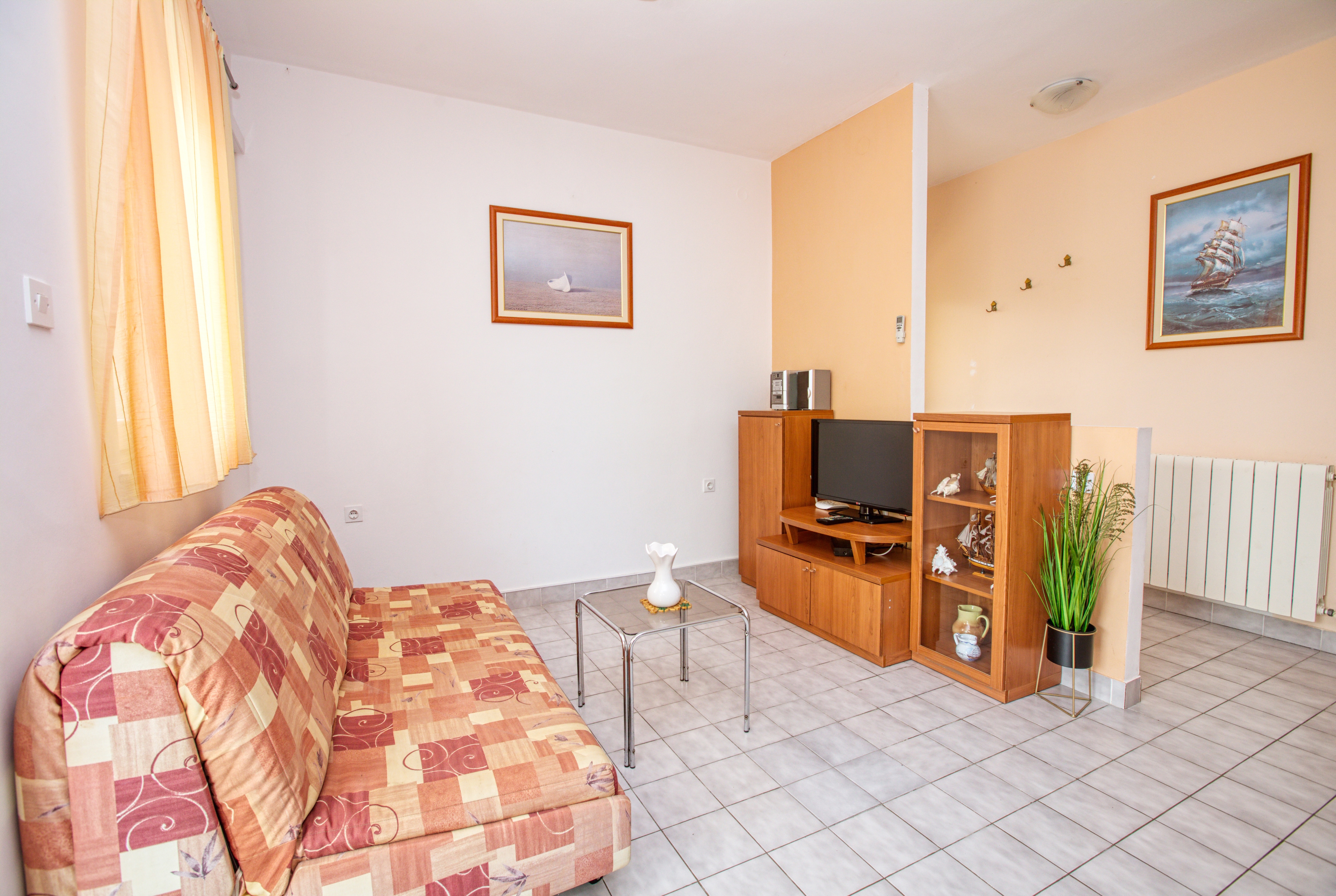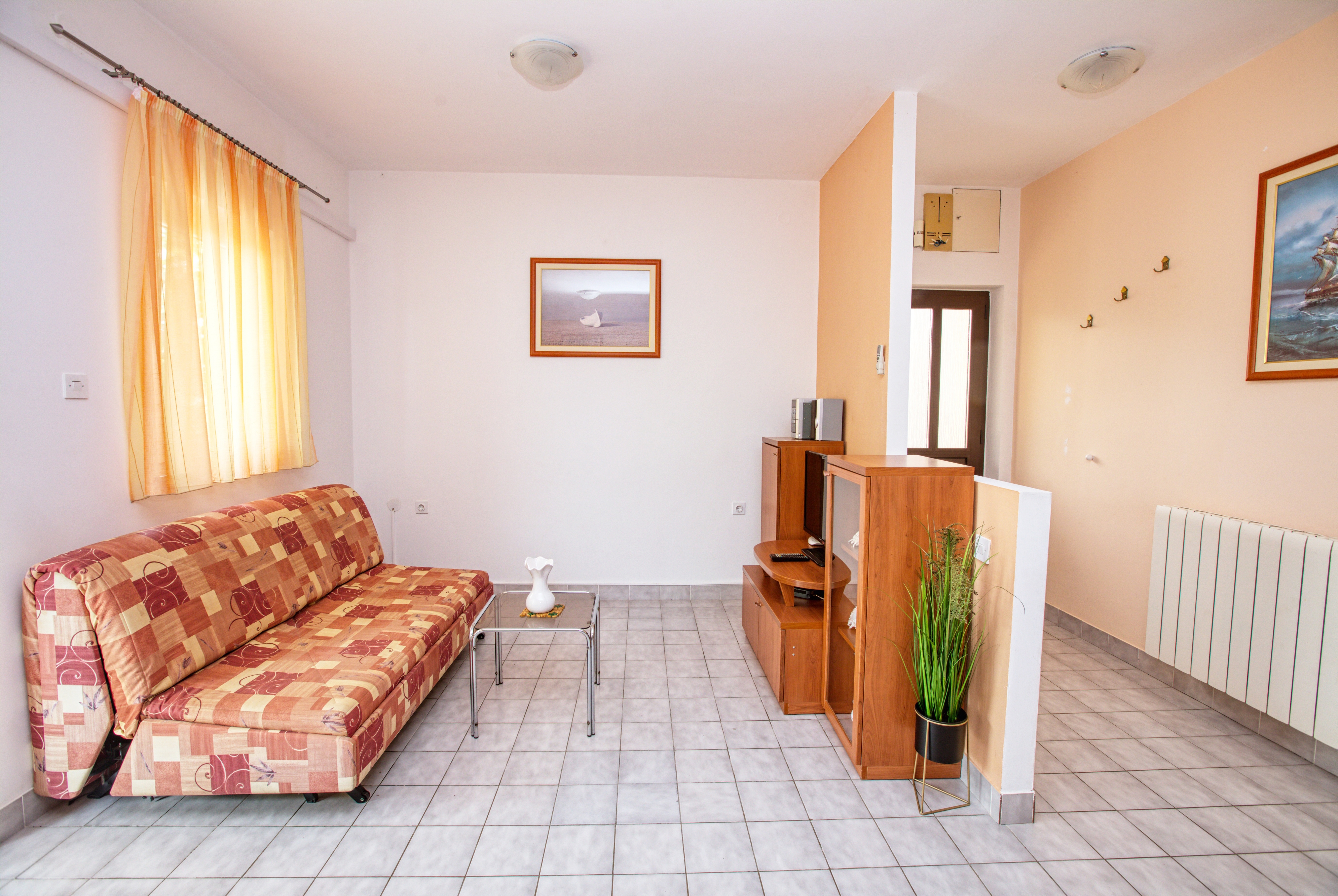 Apartment can accommodate 4 guests. Beds are situated in 1 sleeping rooms, but also in the living room, within 40m2. Guests can use a private terrace to enjoy the warm summer evenings. Food can be prepared using barbecue which is shared with other guests too. This accommodation unit welcomes pets at an additional charge. INCLUDED IN THE PRICE: tourist tax, final cleaning, air-conditioning, central heating, parking, internet, iron, ironing board, hairdryer. OBLIGATORY ADDITIONAL COSTS: short stay fee (surcharge depending on a number of booked nights: 30% - 1, 20% - 2, 10% - 3). OPTIONAL ADDITIONAL COSTS: laundry (€5.00 washing), pets (€20.00 per night). The availability of additional services for your chosen dates of stay, as well as their prices (if none are listed) must be checked ahead of time. Any additional services not shown in the price calculation are payable directly to the property owner and only if used by the visitor.