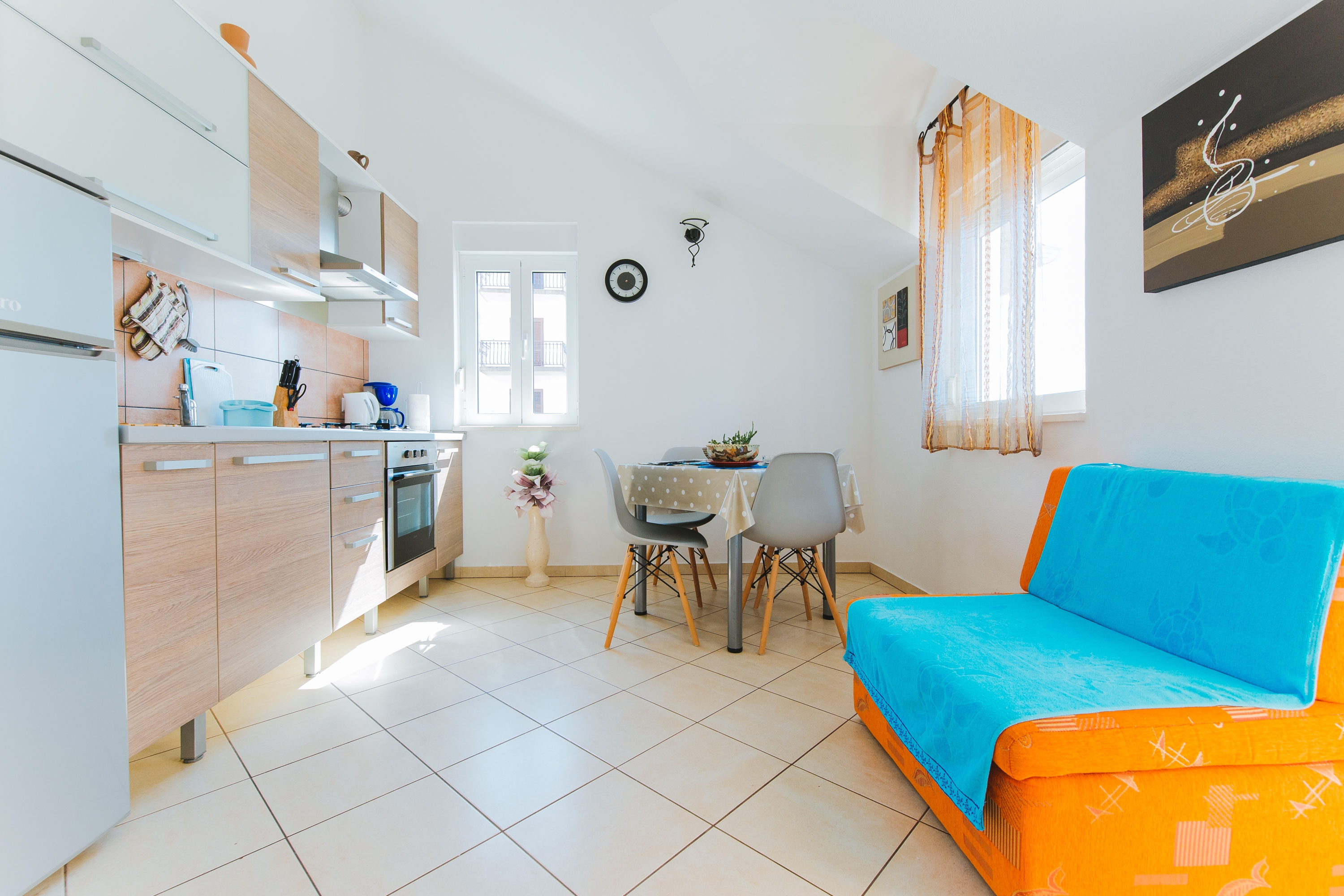Apartment can accommodate 4 guests. Beds are situated in 2 sleeping rooms, within 43m2. Guests can use a private terrace to enjoy the warm summer evenings. The apartment offers the sea view. Food can be prepared using barbecue which is shared with other guests too. INCLUDED IN THE PRICE: tourist tax, final cleaning, air-conditioning, parking, internet, baby cot, iron, ironing board, sunshade, sunchairs. OPTIONAL ADDITIONAL COSTS: laundry (€5.00 washing). The availability of additional services for your chosen dates of stay, as well as their prices (if none are listed) must be checked ahead of time. Any additional services not shown in the price calculation are payable directly to the property owner and only if used by the visitor. Discounts to the base price: free day 14=13 (for reservations of 14 or more days you get one free day for the stay until 31122026).
