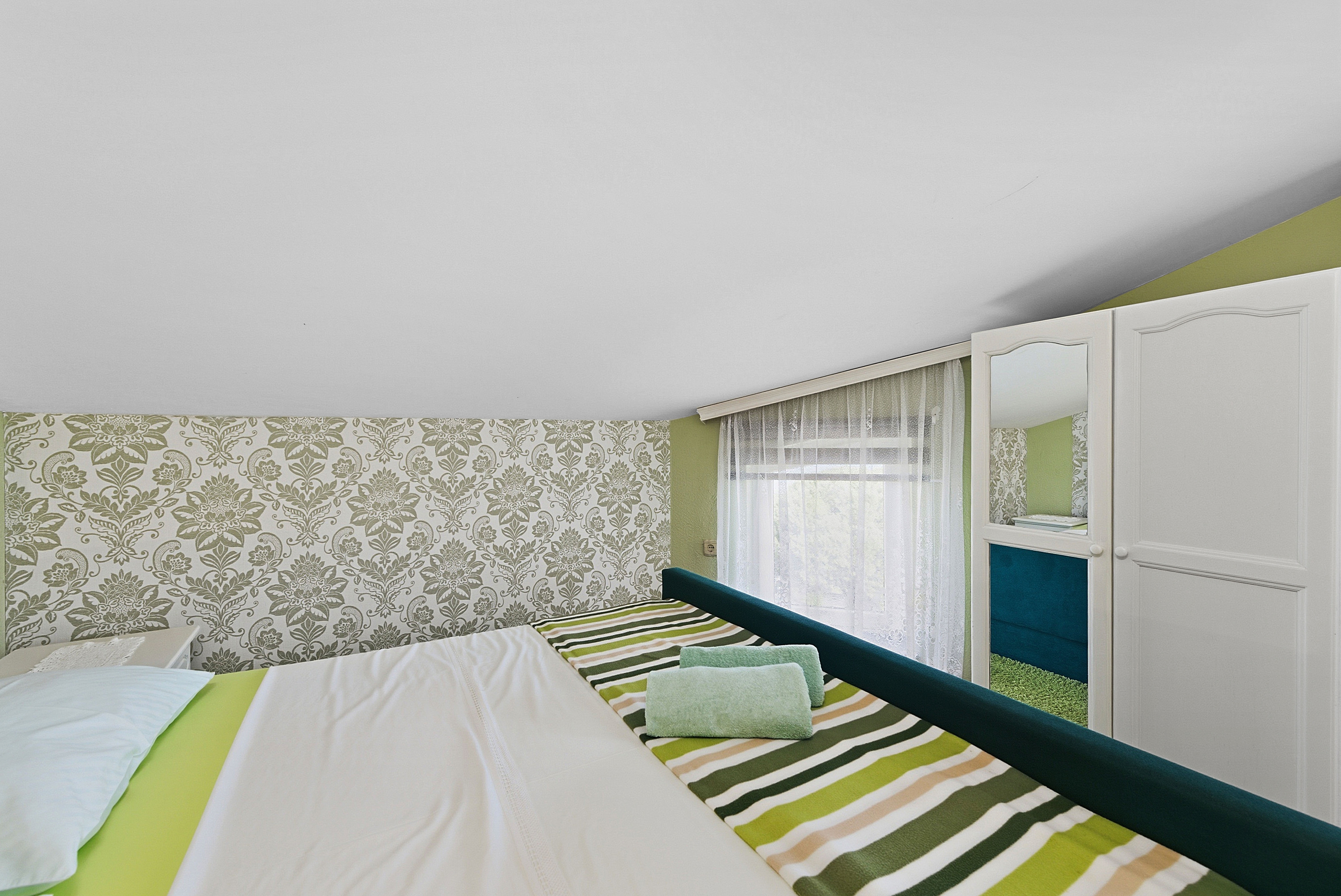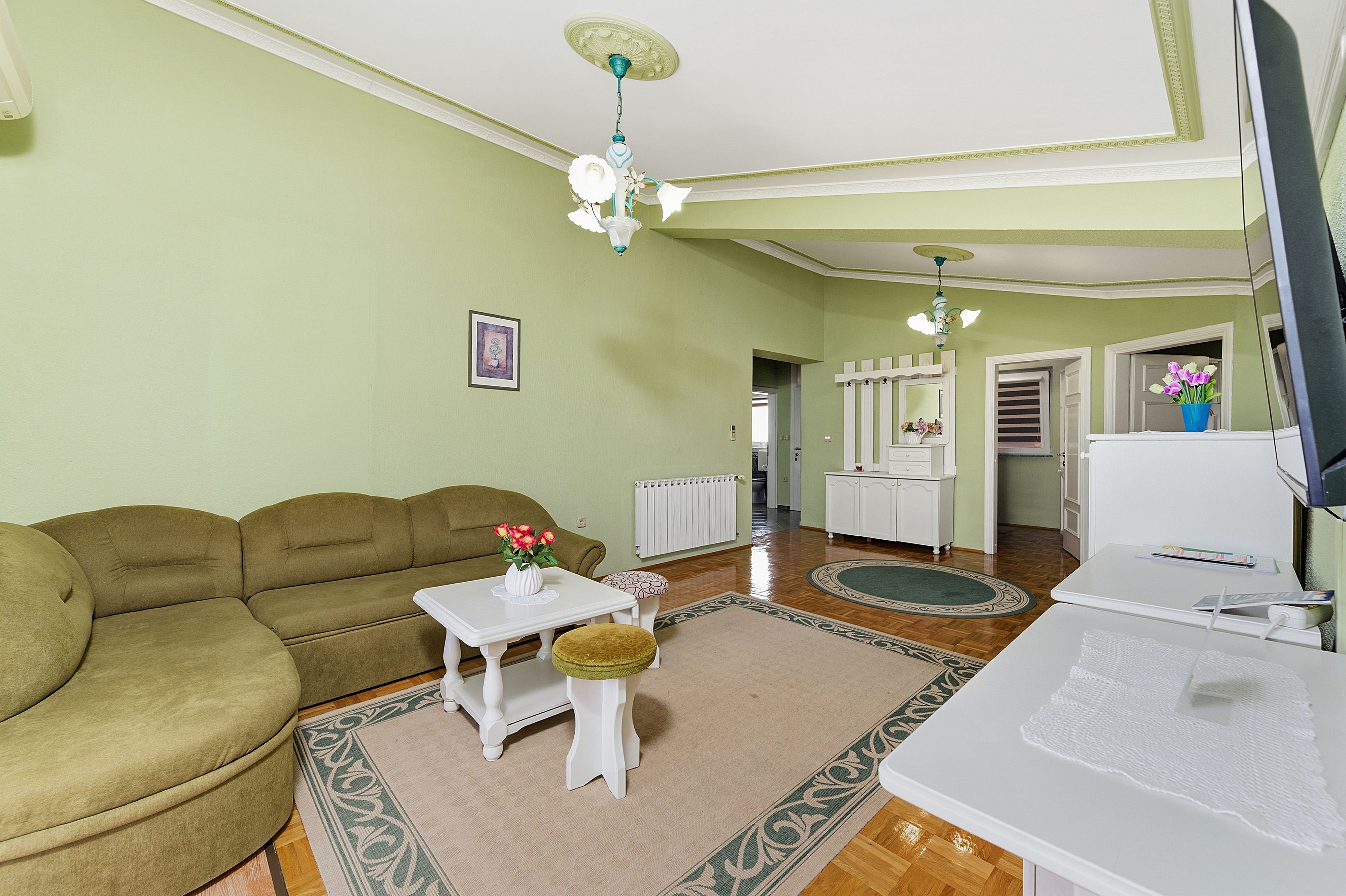 Apartment can accommodate 9 guests. Beds are situated in 4 sleeping rooms, but also in the living room, within 98m2. Guests can use a private balcony to enjoy the warm summer evenings. The apartment offers the sea view. Food can be prepared using barbecue which is shared with other guests too. Shared pool is on disposal during stay. INCLUDED IN THE PRICE: tourist tax, final cleaning, air-conditioning, central heating, pool, parking, internet, baby cot, additional bed, iron, ironing board, hairdryer, sunshade, sunchairs. OBLIGATORY ADDITIONAL COSTS: short stay fee (surcharge depending on a number of booked nights: 30% - 1, 20% - 2, 10% - 3). OPTIONAL ADDITIONAL COSTS: breakfast (€10.00, a 50% discount for children aged 4 to 12 years, Children up to age 4 free of charge), half-board (€25.00, a 50% discount for children aged 4 to 12 years, Children up to age 4 free of charge), full board (€40.00, a 50% discount for children aged 4 to 12 years, Children up to age 4 free of charge). The availability of additional services for your chosen dates of stay, as well as their prices (if none are listed) must be checked ahead of time. Any additional services not shown in the price calculation are payable directly to the property owner and only if used by the visitor.