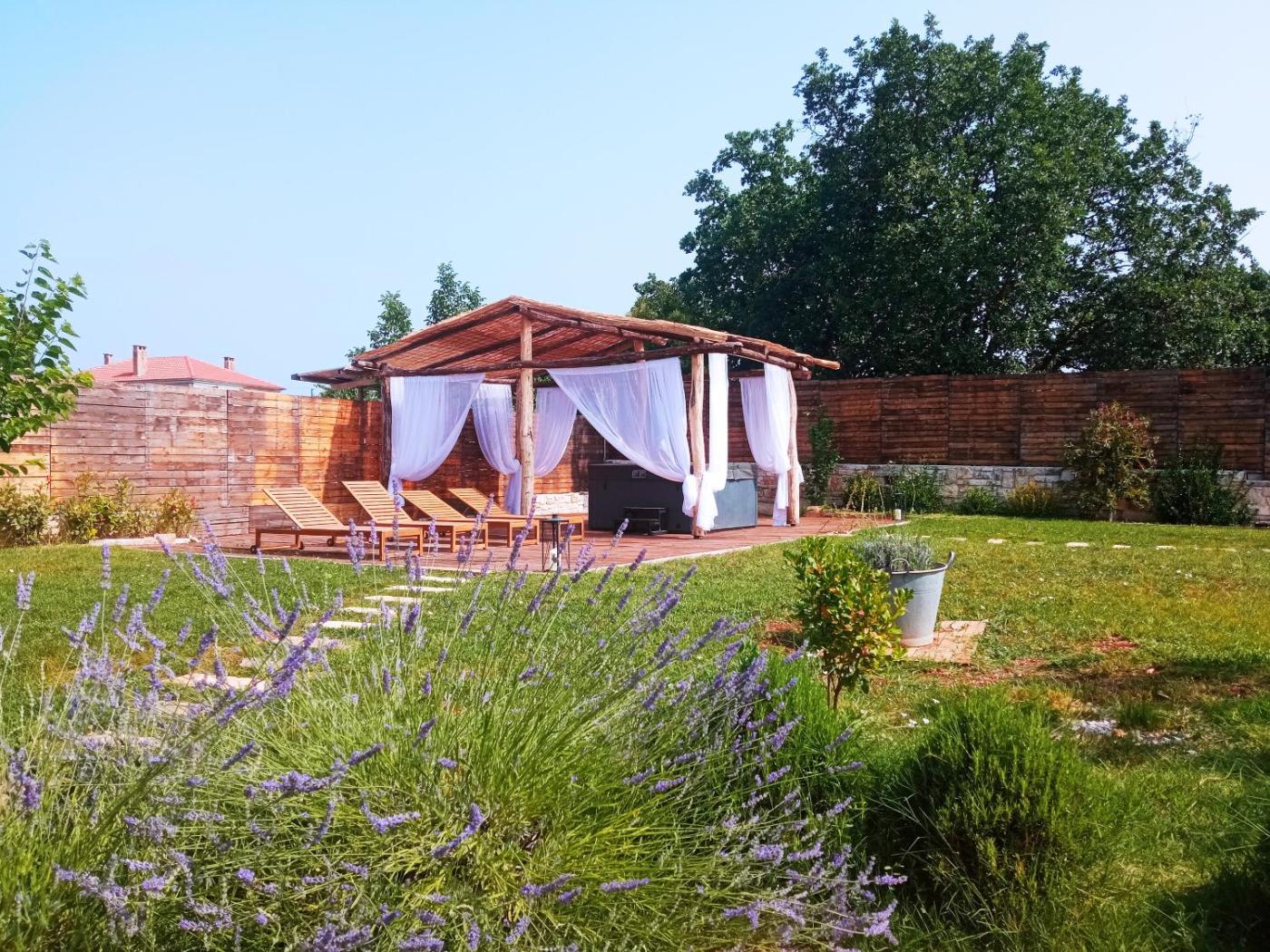 Two-Bedroom House. This holiday home features a hot tub. Boasting a private entrance, this spacious holiday home also features 2 bedrooms, a seating area and 2 bathrooms with a shower and a bidet. Guests will find a stovetop, a refrigerator, a dishwasher and kitchenware in the kitchen. The holiday home also comes with a barbecue. The air-conditioned holiday home features a flat-screen TV with satellite channels, a washing machine, a tea and coffee maker, a dining area as well as garden views. The unit has 2 beds.